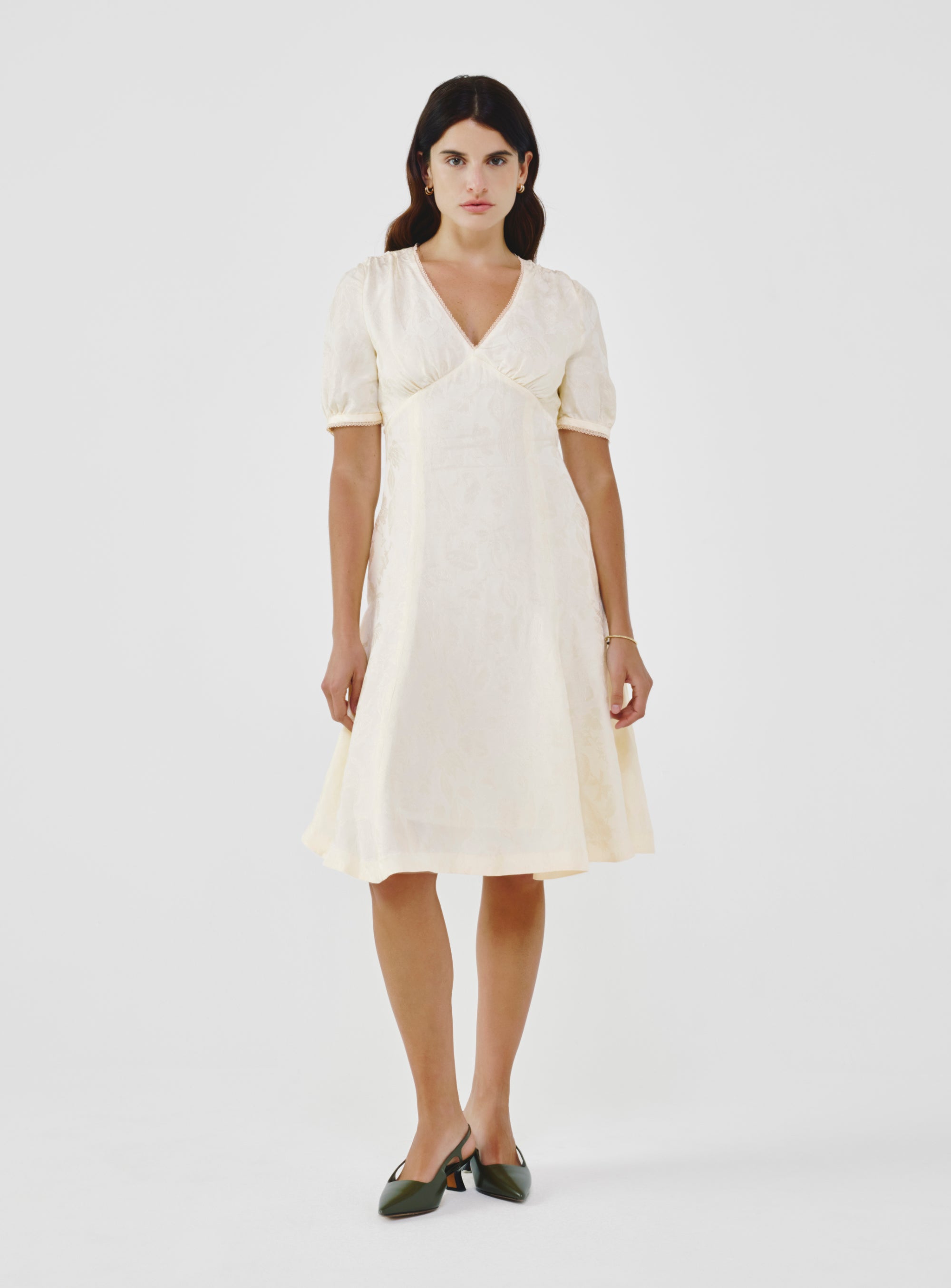 A softly structured midi dress in richly woven floral jacquard, where pattern emerges through texture rather than print. The V-neckline and defined waist create a balanced silhouette, finished with a gently flared skirt for fluid movement.