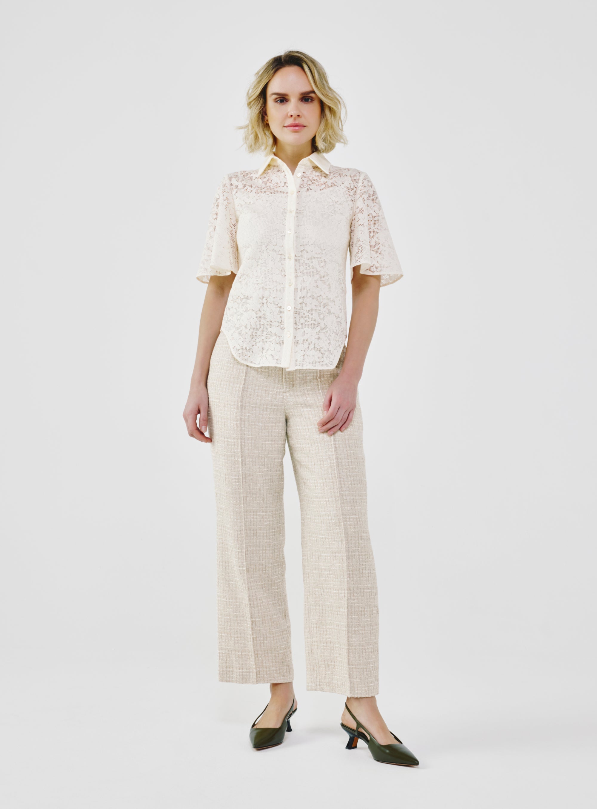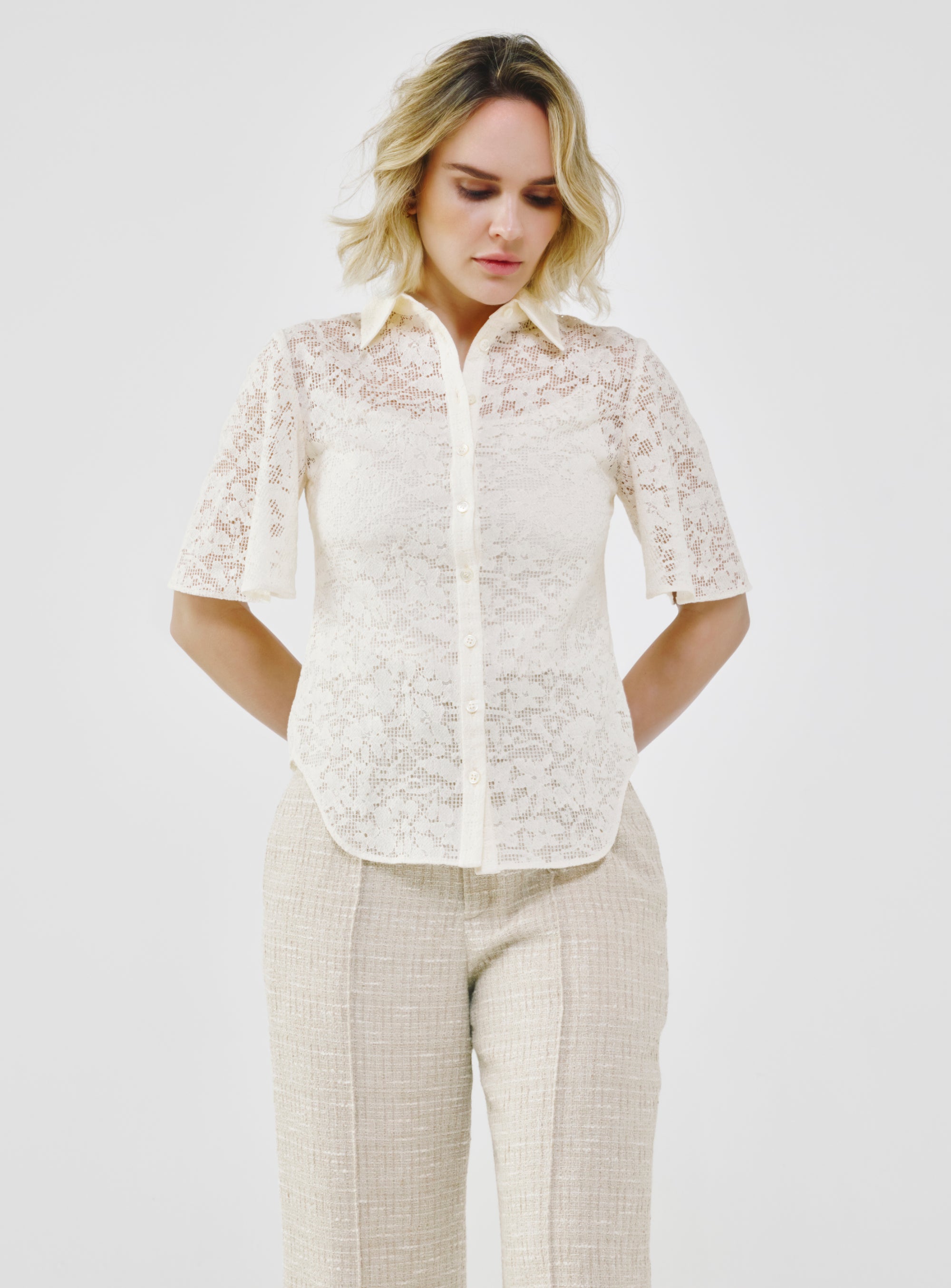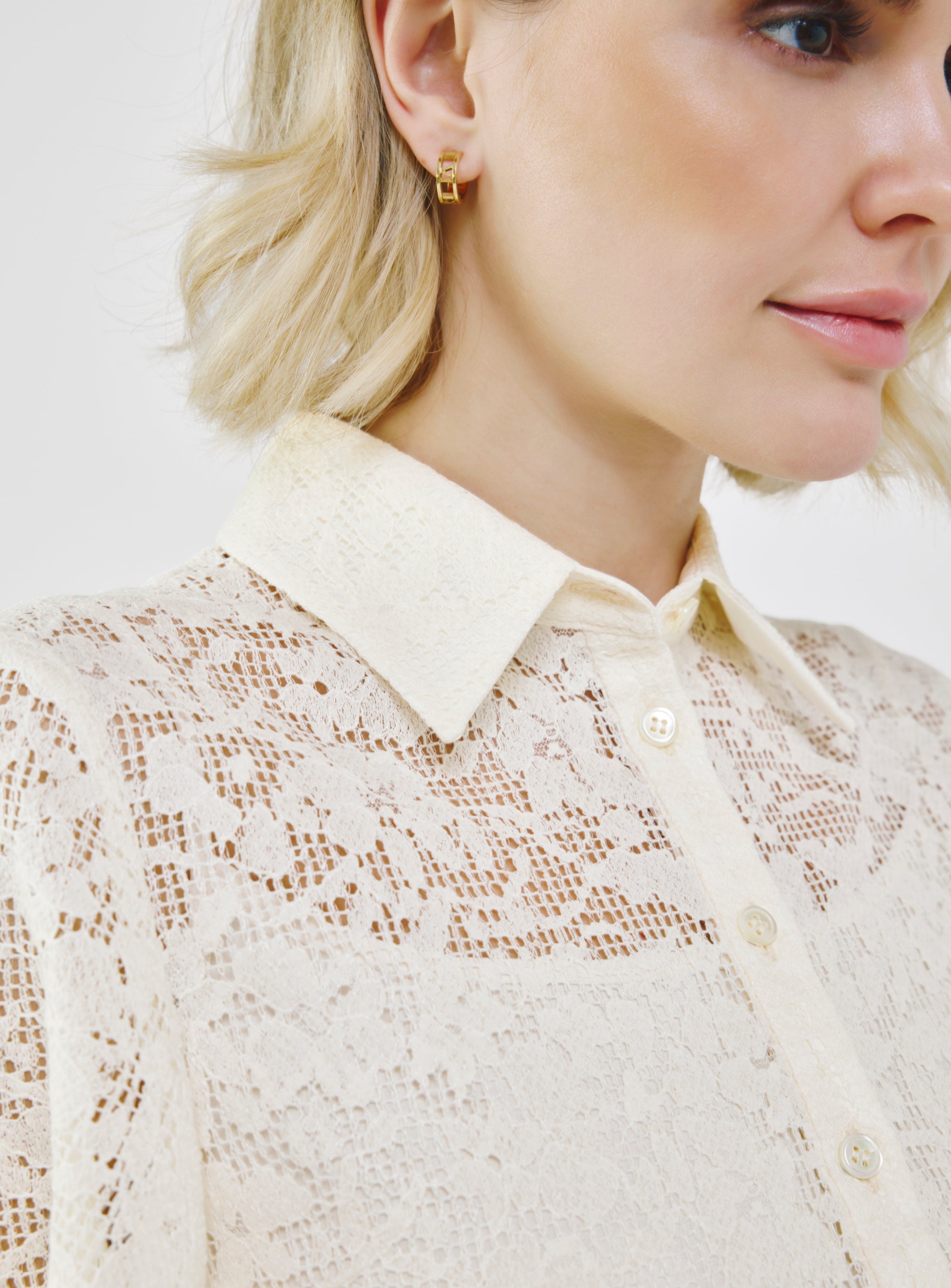 A lace shirt that reinterprets classic shirting through texture and clean proportion. Subtly flared sleeves introduce fluid movement, while the extended length creates a refined, elongated line.