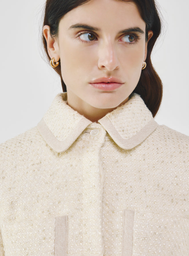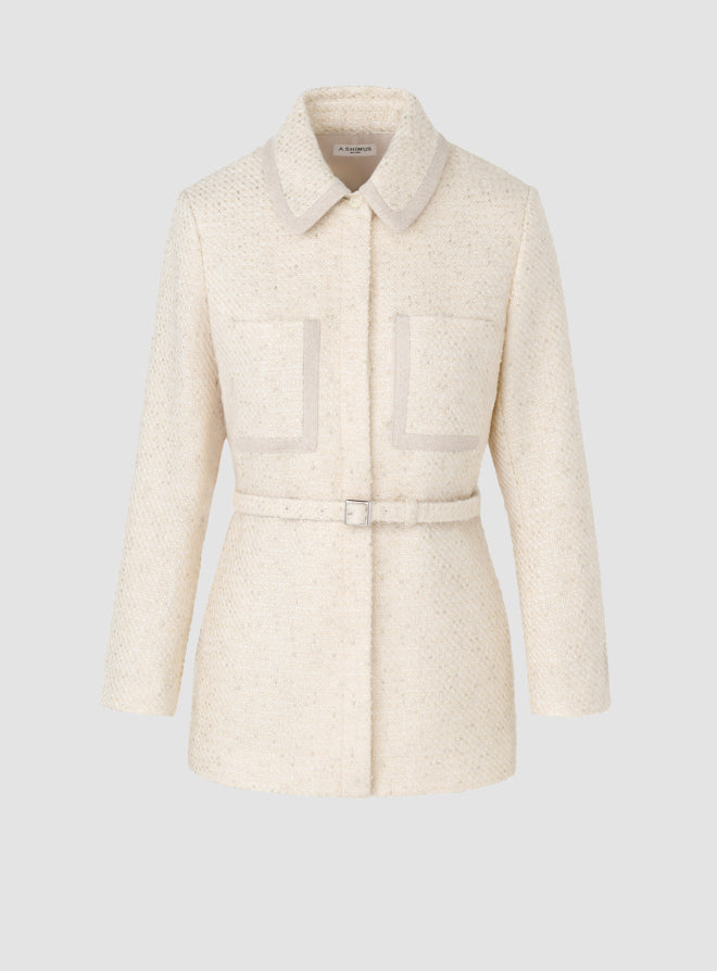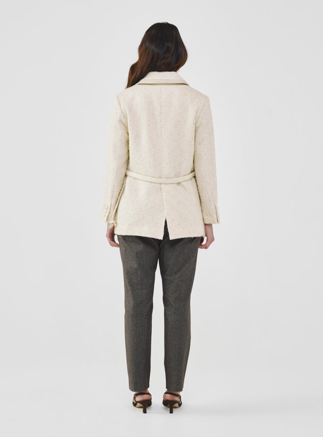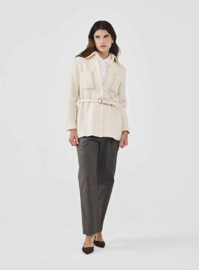 This jacket features a high-waist belt and subtle shoulder pads that emphasize a feminine yet empowering look. Crafted from contrasting tweeds with delicate sparkles in cream and ivory, it brightens the complexion while adding a contemporary edge. Carefully tailored, it’s a versatile piece that enhances your natural poise.