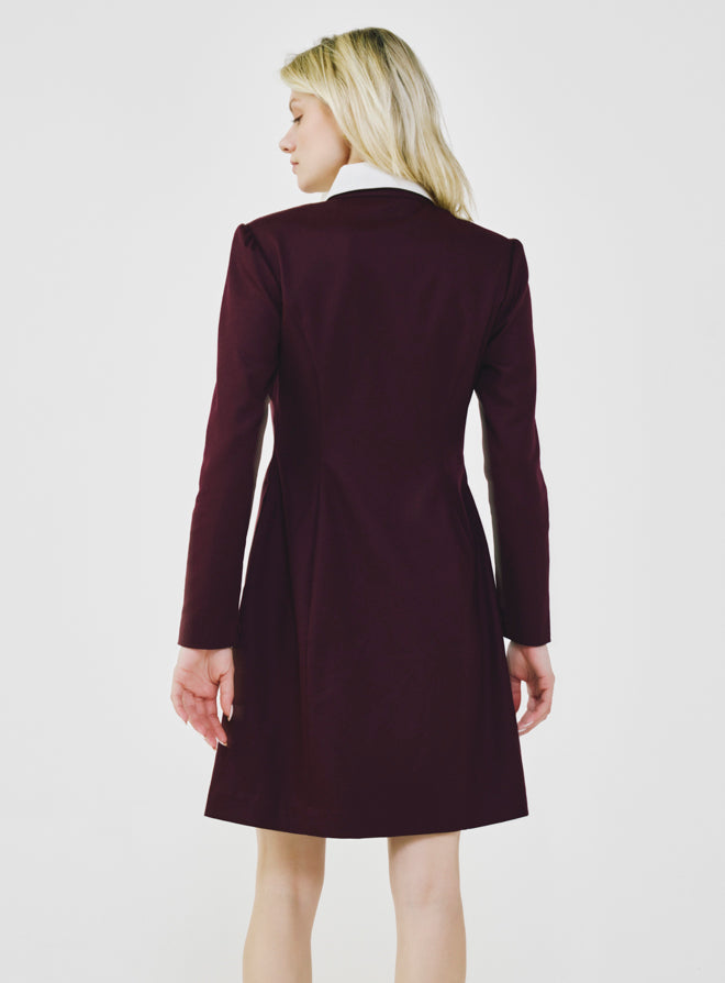 This dress features a removable white collar, allowing you to switch effortlessly between two distinct looks. Pair it with heels for a dinner date or sneakers for the office—its versatility makes it an easy go-to. The rich navy and bordeaux hues bring depth and sophistication, perfect for this fall / winter season.